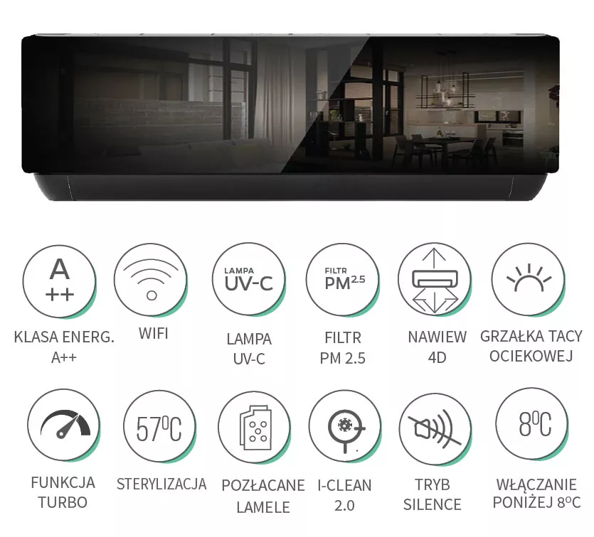 Model ECLIPSE UV to klimatyzator w głębokim, błyszczącym kolorze Piano Black, który odpowiada na rosnące zainteresowanie urządzeniami o nowoczesnym i eleganckim wyglądzie. Wyjątkowy charakter tego modelu podkreśla jego luksusowy design, doskonale komponujący się z wnętrzami minimalistycznymi, loftowymi czy glamour. To nie tylko funkcjonalne urządzenie, ale również element dekoracyjny, który wprowadza do pomieszczenia nutę wyrafinowania. ECLIPSE UV łączy zaawansowaną technologię z wygodą użytkowania. Dzięki pilotowi bezprzewodowemu i modułowi WiFi 2.0 sterowanie jest niezwykle intuicyjne. Model został wyposażony w filtry High Density oraz PM 2.5, które skutecznie oczyszczają powietrze, a także lampę UV-C eliminującą bakterie i wirusy, w tym SARS-CoV-2. Funkcja zapobiegania wychłodzeniu pomieszczenia, która aktywuje urządzenie, gdy temperatura spadnie poniżej 8°C, zapewnia komfort nawet w najchłodniejsze dni. Dzięki trwałej obudowie z tworzywa ABS i nowoczesnemu designowi, doskonale wpisuje się w każde wnętrze łącząc w sobie zaawansowaną technologię, elegancki wygląd i niezawodną funkcjonalność.