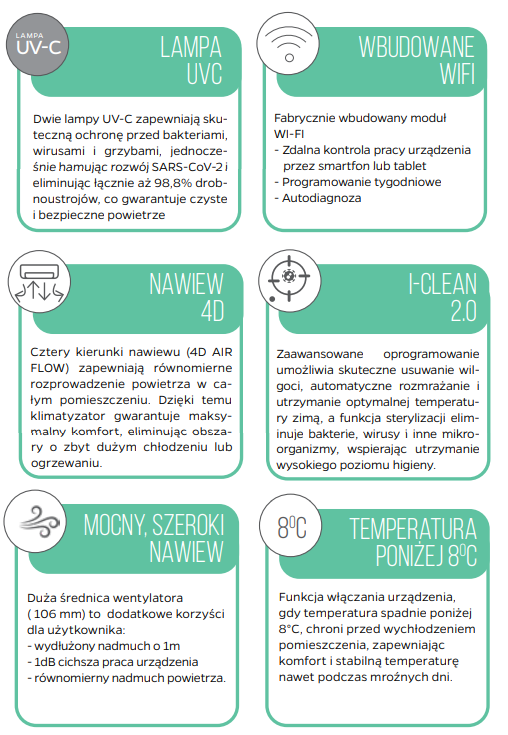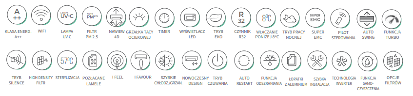 Starannie zaprojektowany model w wyjątkowej, matowej stylistyce. Sterowanie odbywa się za pomocą nowoczesnego pilota bezprzewodowego oraz systemu WiFi 2.0. Jeden z najcichszych na rynku , co zapewnia komfort użytkowania nawet w nocy. Urządzenie posiada zaawansowany technologicznie filtr przeciwkurzowy High Density oraz filtr PM 2.5, które skutecznie oczyszczają powietrze. Dodatkowo, w modelu zastosowano lampę UV-C, hamującą rozwój bakterii i wirusów, w tym SARS-CoV-2. Klimatyzator oferuje również funkcję automatycznego włączania przy spadku temperatury poniżej 8°C, co sprawia, że doskonale sprawdza się w wymagających warunkach. Obudowa w śnieżnobiałym kolorze wyróżnia się prostą formą z delikatnymi zaokrągleniami, wykonana z odpornego na uszkodzenia i łatwego w czyszczeniu tworzywa ABS. Precyzyjnie dopasowane elementy oraz gładka powierzchnia o matowym wykończeniu nadają urządzeniu elegancki i nowoczesny wygląd. Dodatkowym akcentem dekoracyjnym jest subtelny, srebrny profil nad żaluzją nawiewną.