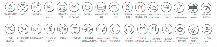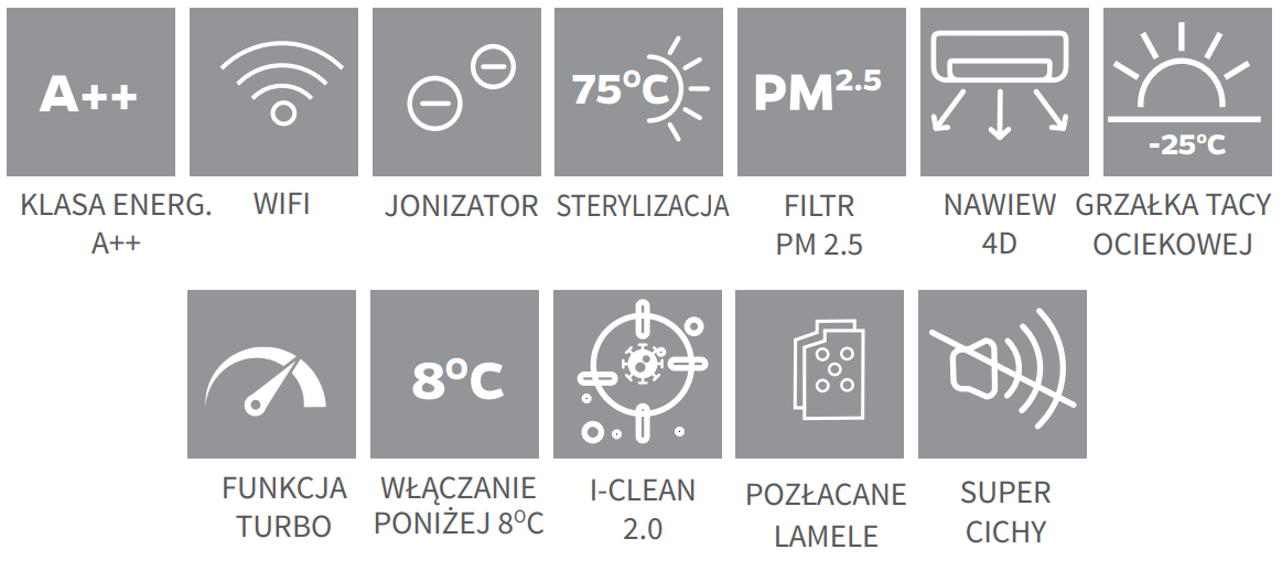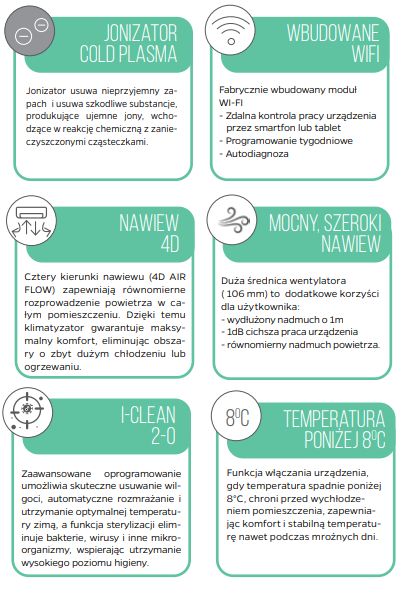 Model ANDE QUANTUM to klimatyzator o doskonałym designie, idealnie wpisujący się w najnowsze trendy wnętrzarskie, podkreślając elegancję pomieszczenia. Stylowe urządzenie nie tylko prezentuje się estetycznie, ale także oferuje innowacyjne funkcje dla zapewnienia bezpieczeństwa i komfortu użytkowania. Wyposażony w Jonizator COLD PLASMA usuwa nieprzyjemne zapachy i szkodliwe substancje produkując ujemne jony, wchodząc w reakcję chemiczną z zanieczyszczonymi cząsteczkami. Dodatkowo, zaawansowane funkcje, takie jak włączanie urządzenia przy temperaturze poniżej 8°C, efektywne usuwanie wilgoci, rozmrażanie oraz utrzymanie optymalnej temperatury w zimie, sprawiają, że klimatyzator dba o komfort użytkowania przez cały rok. Funkcja sterylizacji eliminuje bakterie, wirusy, i inne mikroorganizmy, przyczyniając się do utrzymania wysokiej higieny. Dzięki czterem kierunkom nawiewu powietrza 4D AIR FLOW, urządzenie równomiernie rozprowadza powietrze, podnosząc poziom komfortu w całym pomieszczeniu.